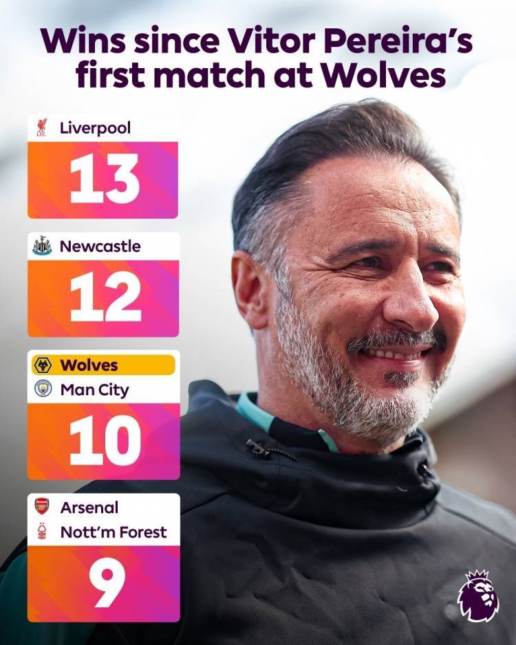 佩雷拉去年12月中旬上任狼队帅位,当时狼队2胜3平11负积9分,排名英超倒数第2。自佩雷拉上任以来,狼队英超已经取得10场胜利,同期仅次13胜的利物浦和12胜的纽卡,与曼城并列第三。