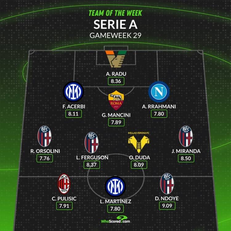 直播吧3月17日讯 WhoScored根据球员的评分列出了意甲第29轮最佳阵容,劳塔罗、阿切尔比、普利西奇在列,博洛尼亚4名球员入选。
