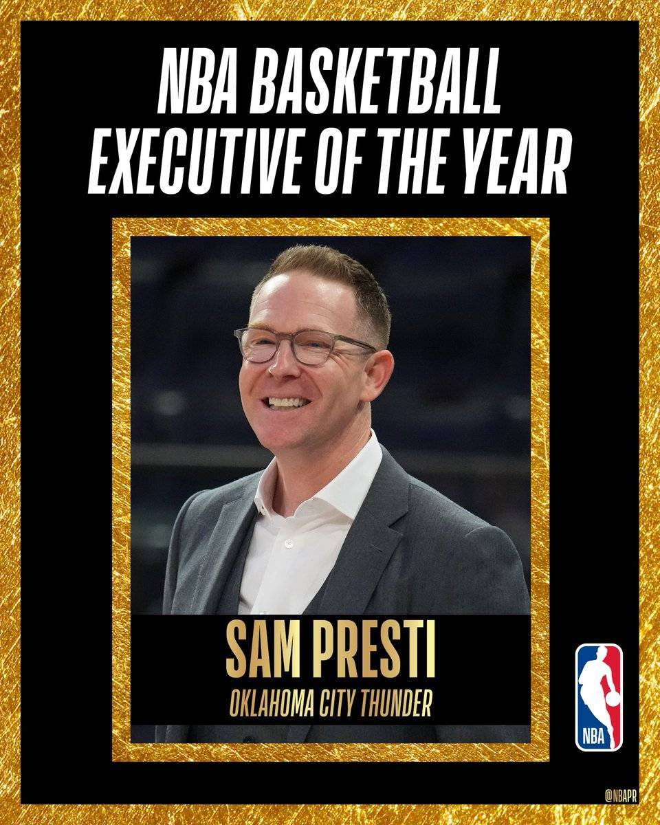 北京时间2025年5月7日,据Shams透露,雷霆总经理萨姆-普雷斯蒂当选年度最佳总经理。