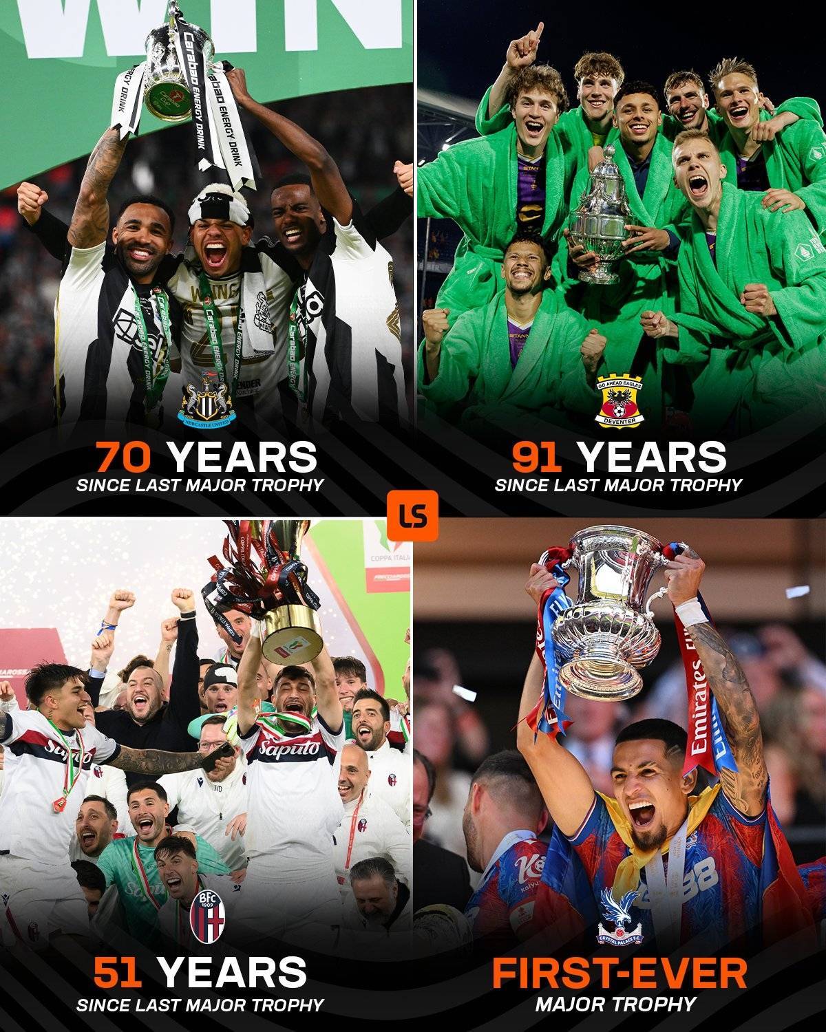收获的一年!纽卡、博洛尼亚和水晶宫本赛季均打破多年冠军荒