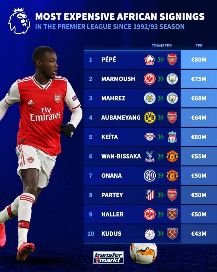 直播吧6月17日讯 近日,德转官方总结了进去英超时代后非洲球员转会费最高的10名球员,其中尼古拉斯-佩佩以8000万欧居首,马尔穆什、马赫雷斯分别以7500万欧和6800万欧列二三位。
